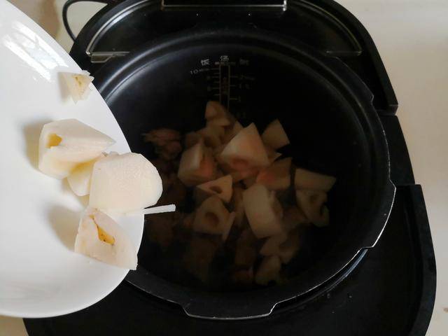 2. 将莲藕去皮后切成小块放入电炖锅中,