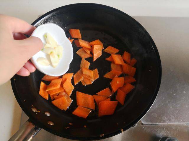 2. 烧热锅放入适量的油,加入准备好的胡萝卜片放进锅中翻炒几下,这样更利于胡萝卜素的吸收,再加入少许蒜片放进锅中翻炒几下;