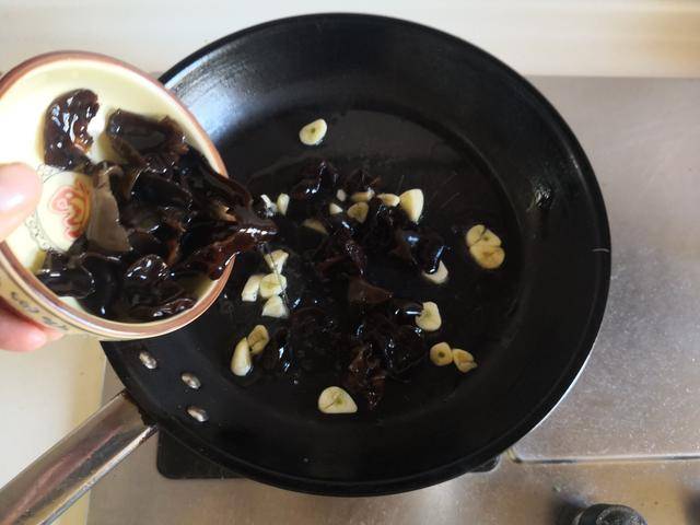 2. 烧热锅放入适量的油,将少许蒜片放进锅中翻炒几下,加入焯好的黑木耳放进锅中翻炒几下;