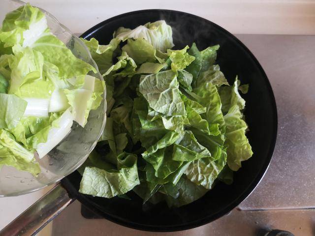 3. 加入洗净的白菜叶放进锅中翻炒几下;