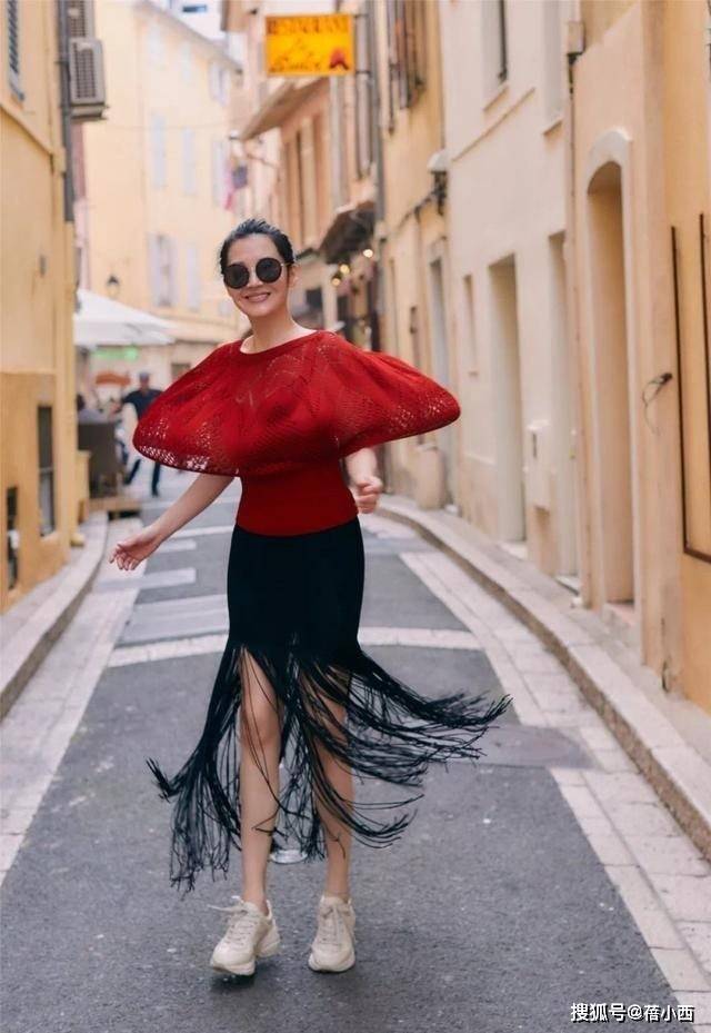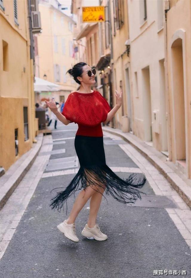 上半身这款红衣太有个性了吧,日常生活走在大街上几乎没人敢这么穿,大多出现在街拍或者走秀等场合。主要是因为红衣的上半部分向四周撑开,低头估计都看不到脚面。下身则搭了一件流苏裙,黑色与红色是很经典的组合,在时尚圈流行多年,流苏设计能增强裙子神秘感。