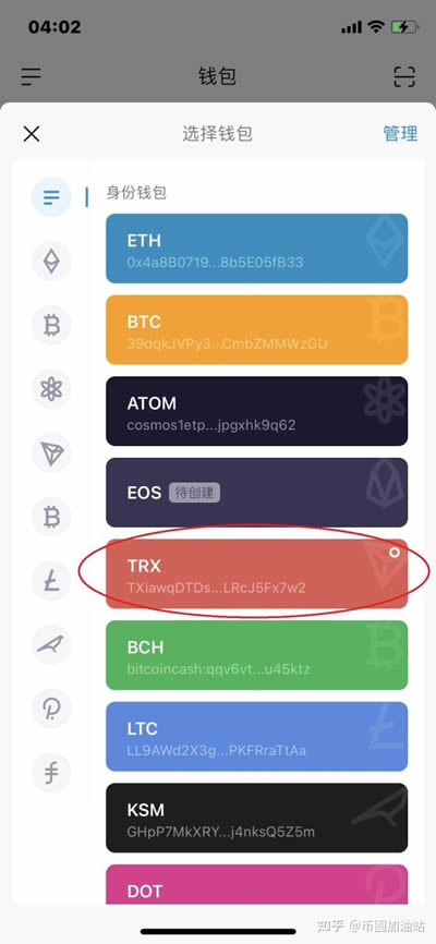 第一步:启动你的imToken,找到左上角的三条横线,点击它。在弹出的菜单中,选择你的波场TRX账户(当然,你也可以选择其他,比如Bsc,eth,heco,这里只是举个例子)。