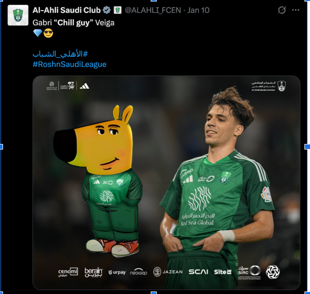 不过,最引人注目的还是足球运动员和球迷。很多球员在进球后对着镜头摆出“Chill Guy”的姿势。一位冉冉升起的超级巨星甚至赢得了“Chill Guy”的绰号。随着他最近转会到某世界上最大的俱乐部,众多球迷都开始用“Chill Guy”表情包来欢迎他。