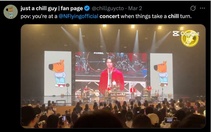 最近,Chill Guy 在亚洲一些国家人气飙升。在某亚洲国家,很多人都在用这个表情包,或者在现实生活中模仿 Chill Guy 的造型。某流行乐队甚至在一场演唱会上模仿 Chill Guy 的造型: