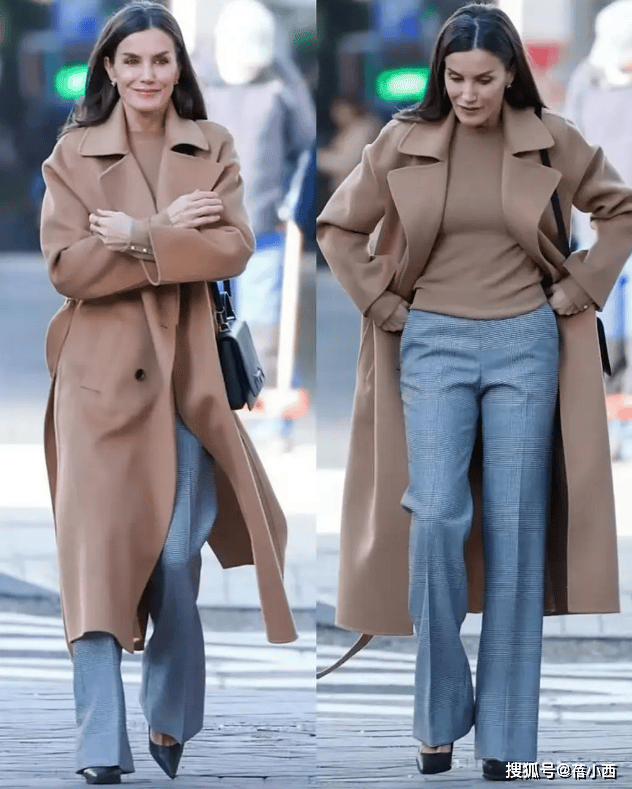 在穿大衣的时候,莱蒂齐亚从不用短裙博眼球,她的裙装永远精准落在膝盖下方5-10厘米处,既不拖沓也不暴露。直筒款、A字款是她的偏爱,面料多选用羊毛、真丝混纺等自带质感的材质,一看就很高级。