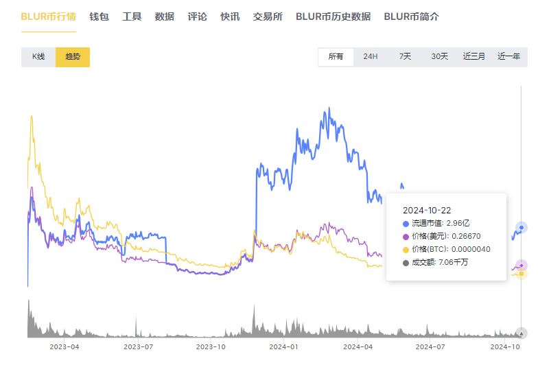 BLUR币虽然在NFT市场中有一定的影响力和交易量,但它还未被广泛认为是龙头币。龙头币通常是在特定板块或整个加密货币市场中具有领导地位的币种,而BLUR币主要与NFT市场相关联,其全球市值排名在第156位,市值占比仅为0.03%。此外,BLUR币的最大发行量为3亿,当前流通量为1.955亿,流通率为65.17%。这些数据表明,虽然BLUR币在NFT市场中有一定的地位,但尚未达到龙头币的标准。