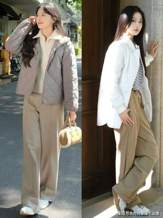 运动鞋的搭配虽然舒适,但是增高的效果比较差,同时运动鞋的厚重感太强,容易和厚实的羽绒服产生臃肿感,其次运动裤的版型大多数都很宽松,材质软塌塌的缺乏支撑感,这时候搭配宽松羽绒服也十分地显胖,大骨架或者身材发福的中年女性们如果这样的搭配,势必会显得老土还壮实。