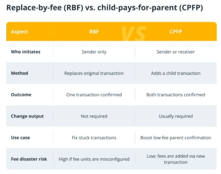 - CPFP: 由发送方或接收方发起,通过添加一笔高手续费的子交易来提高父交易的优先级。