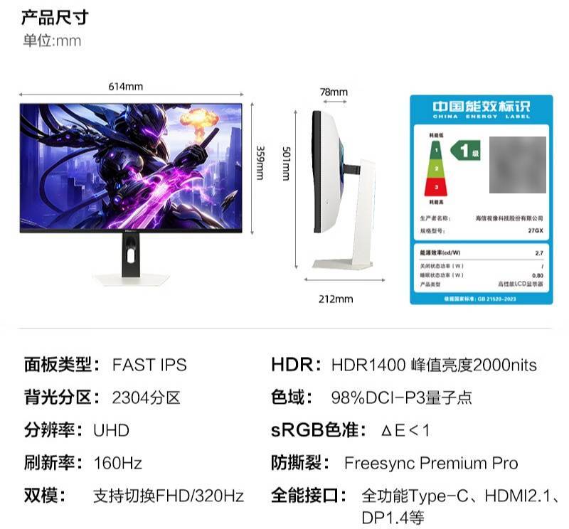 海信27GX双模显示器开售:4K 160Hz/1080P 320Hz切换 首发黑曜屏技术