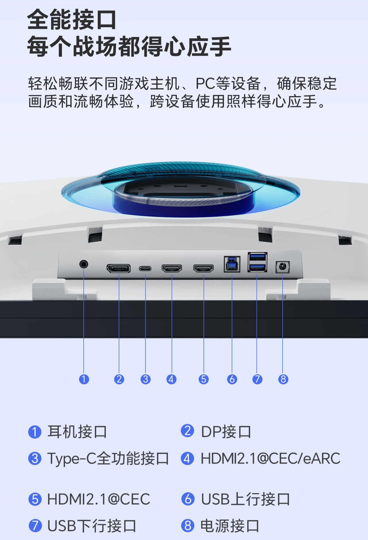 接口方面,海信 27GX 显示器拥有全能接口,包括:接口、DP 接口、Type-C 全功能接口、HDMI 2.1 @CEC/eARC、HDMI 2.1 @CEC、USB 上行接口、USB下行接口和电源接口。