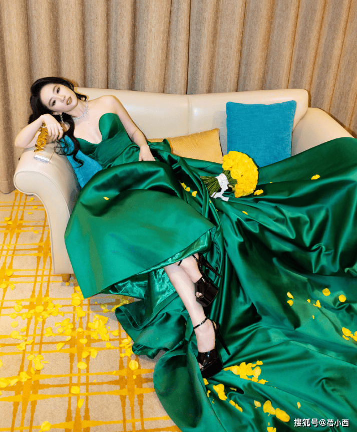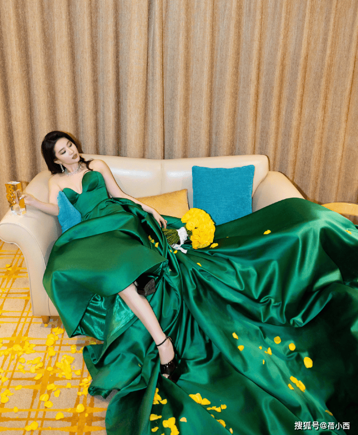 绿色裙子腰部是收紧的,此设计的出现一点都不让人意外,毕竟每个女生管理身材的目的之一就是,在必要时候展现出来。这条裙子的裙摆特别长,而且松量很多,就是躺在那要想好看,都要整理好一会。如果穿此绿裙走红毯,那么走路时肯定少不了用手拎着点裙摆,必要时候还需用手拽一下。