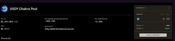 Mantra 推出了 Chakra 池,用户可以将数字货币存入其中,换取 USDY。USDY 是一种由国债支持的稳定货币,目前在 OM 和 ONDO 的激励下,年利率高达 452%。不过需要注意的是,你的存款会被锁定,直到主网上线。