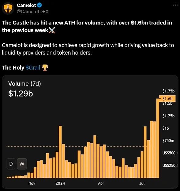Camelot 是一个去中心化交易所,专注于支持 Arbitrum 和其他各种 Orbit 链。随着 Sanko、Reya 和 Xai 等 Arbitrum Orbit 链的推出,Camelot 近期发展迅速。