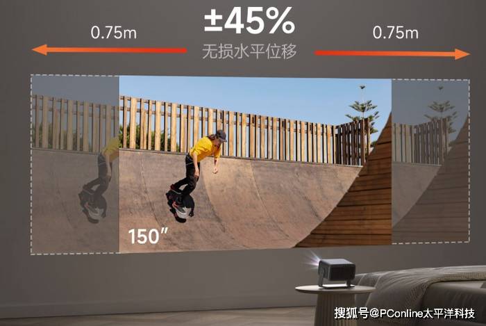 普通投影的侧投依赖数字校正,本质是通过裁切画面边缘来实现方正,不仅损失画面内容,还会导致边缘模糊、色彩失真;即便部分机型支持基础位移,也只能在小范围调整,稍动位置就需重新校准。当贝X7 Max搭载的四向无损镜头位移,±120%的垂直位移与±45%的水平位移范围,可以把它放在客厅角落侧投,不用迁就机身位置,画面也能完整铺满整面墙,没有灰边和裁切;影音室吊装后,想把画面从中间移至墙面下方适配幕布,只需用遥控器轻轻调节,无需拆装机身就能精准定位。