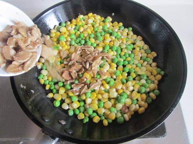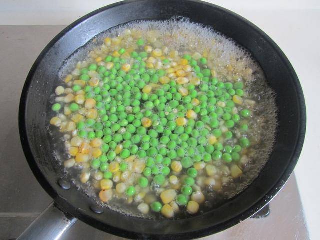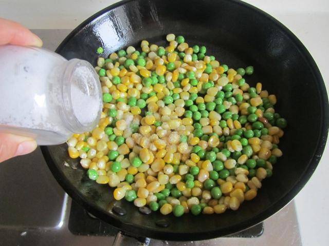 3. 热锅凉油,加入焯好的豌豆米和玉米粒放进锅中翻炒几下,加入少许盐调味,翻炒均匀;
