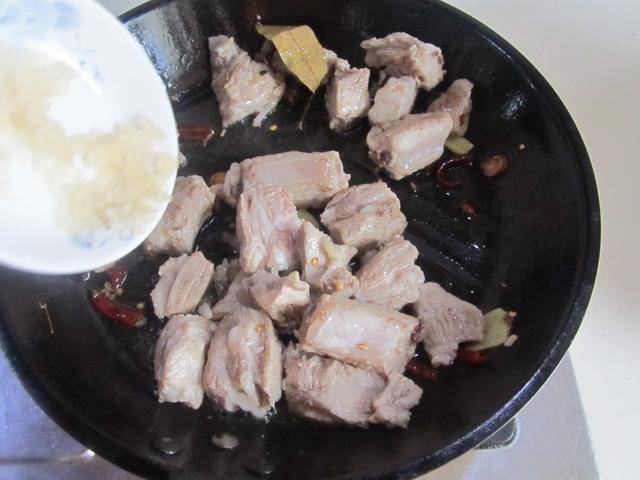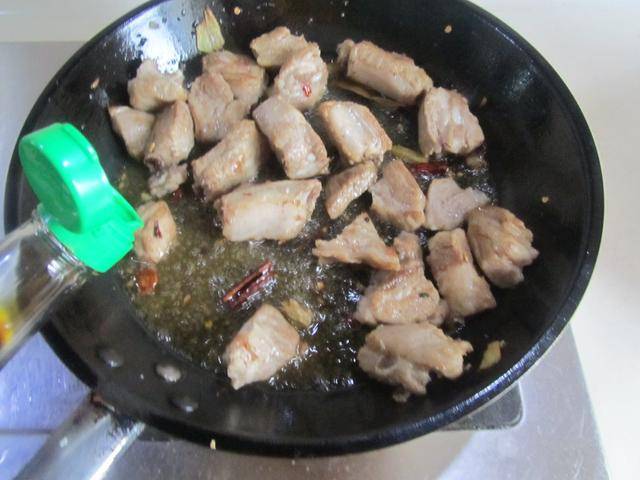 制作过程:1. 选用肋排剁成麻将大小的块,烧热锅放入适量的油,将泡过的排骨放进锅中煸炒干水分,加入准备好的姜片和大料继续翻炒几下,再加入少许冰糖一起翻炒至融化上色;