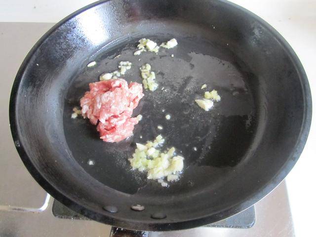 2.烧热锅放入少许油,加入少许葱姜蒜末放进锅中煸炒香,再加入准备好的肉末煸炒干水分,加入少许料酒翻炒几下;