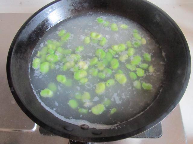 制作过程:1. 烧锅开水,加入少许盐和几滴油,将蚕豆米放进锅中焯煮至八、九成熟后捞出,注意蚕豆米一定要煮熟了吃,避免吃不熟的蚕豆米中毒;