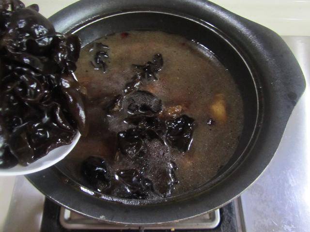 3. 加入适量的水,再加入泡软和黑木耳, 大火煮开后转为小火加盖炖煮20分钟;