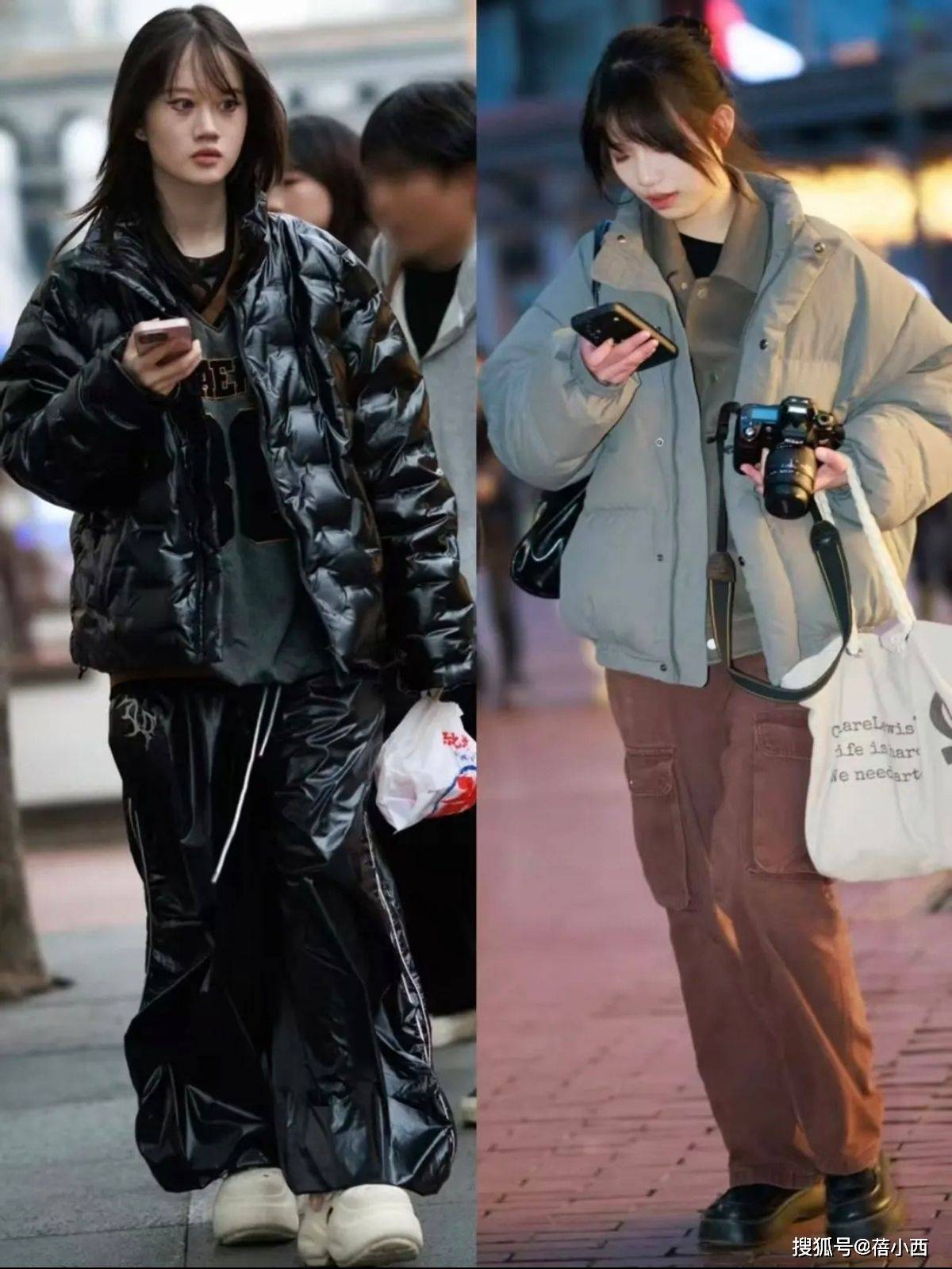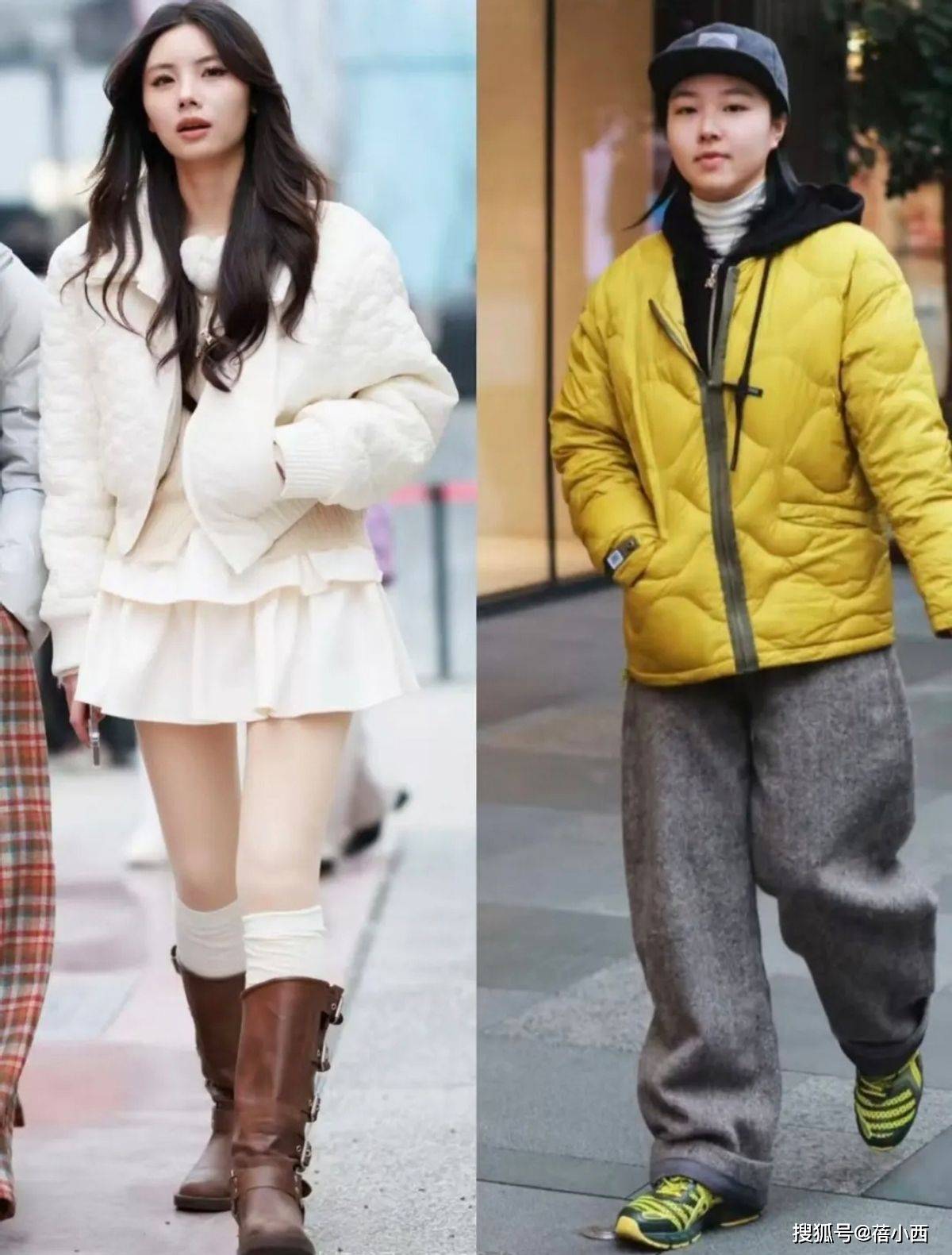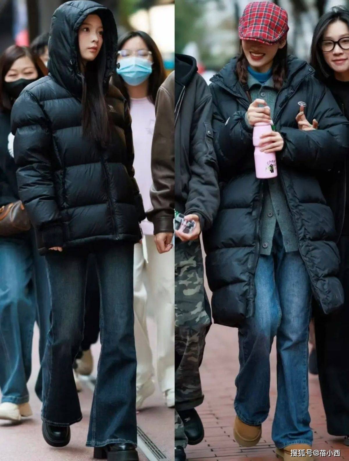 鞋子是搭配的收尾,穿厚重羽绒服时,配雪地靴或厚底坡跟鞋,会让下半身显得很重,头轻脚重特别难看。普通人优先选平底德训鞋、小白鞋,轻盈利落,还能呼应整体风格。