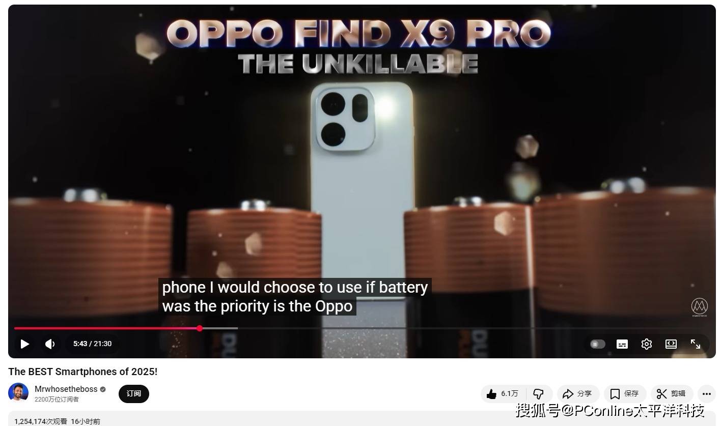 在Mrwhosetheboss的年度评选中,OPPO Find X9 Pro击败苹果和三星等多款一线旗舰机型,荣获年度最佳手机大奖。KOL评价Find X9 Pro:This is the closest we’ve been to a flawless phone,直言这是我们所能见到的最接近完美的手机。