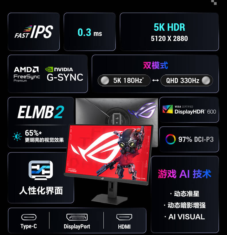 该显示器采用 27 英寸 Fast IPS 面板,支持 5120×2880@180Hz(可超频至 165Hz)和 2560×1440@330Hz 双模切换,响应时间 0.3ms,对比度 1500:1,典型亮度 350cd/㎡,峰值亮度 600cd/㎡,覆盖 97% DCI-P3 色域。