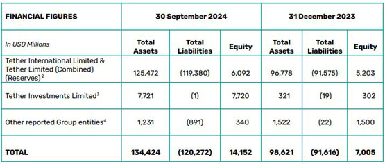 这份报告显示,截至2024年9月30日,Tether集团的总资产达到了125,472,000,279美元,而总负债是119,380,380,143美元。资产比负债多出的这部分,Tether称之为“股东资本缓冲”,金额大约是60.9亿美元。这笔钱,说白了就是Tether给自己留的“安全垫”,而且是超级厚的那种,足以应对市场上的各种风吹草动。