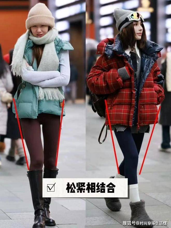 冬天选择穿羽绒服最担心的就是出现臃肿和显胖的问题,那么这时候的我们在挑选服装搭配的时候要避免臃肿感,我们可以借鉴松紧结合的搭配方式,比如像是羽绒服搭配小脚裤,这样宽松有度能够更好的修饰腿型。