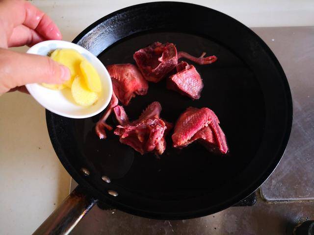 制作过程: 1. 烧热锅放入少许油, 将鸽子块放进锅中翻炒至表面微微发黄, 加入少许姜片进锅翻炒几下;