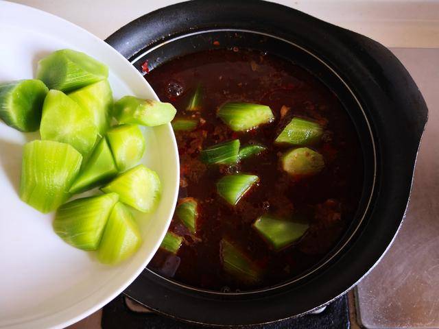 4. 将炖煮好的牛腩汤放入小锅中加热,再将准备好的莴苣块放进锅中去煮上3至5分钟;