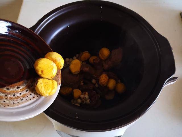 2. 将炒过的鸽子块放入电炖锅中,加入准备好的板栗仁和洗净的莲子米;