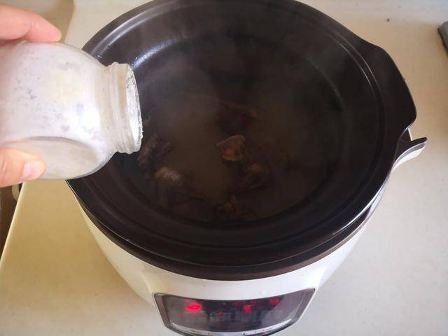 3. 将焯好的牛肉块放进电炖锅中,加入少许水, 加盖焖煮,按下电炖锅上炖煮牛羊肉的功能键;
