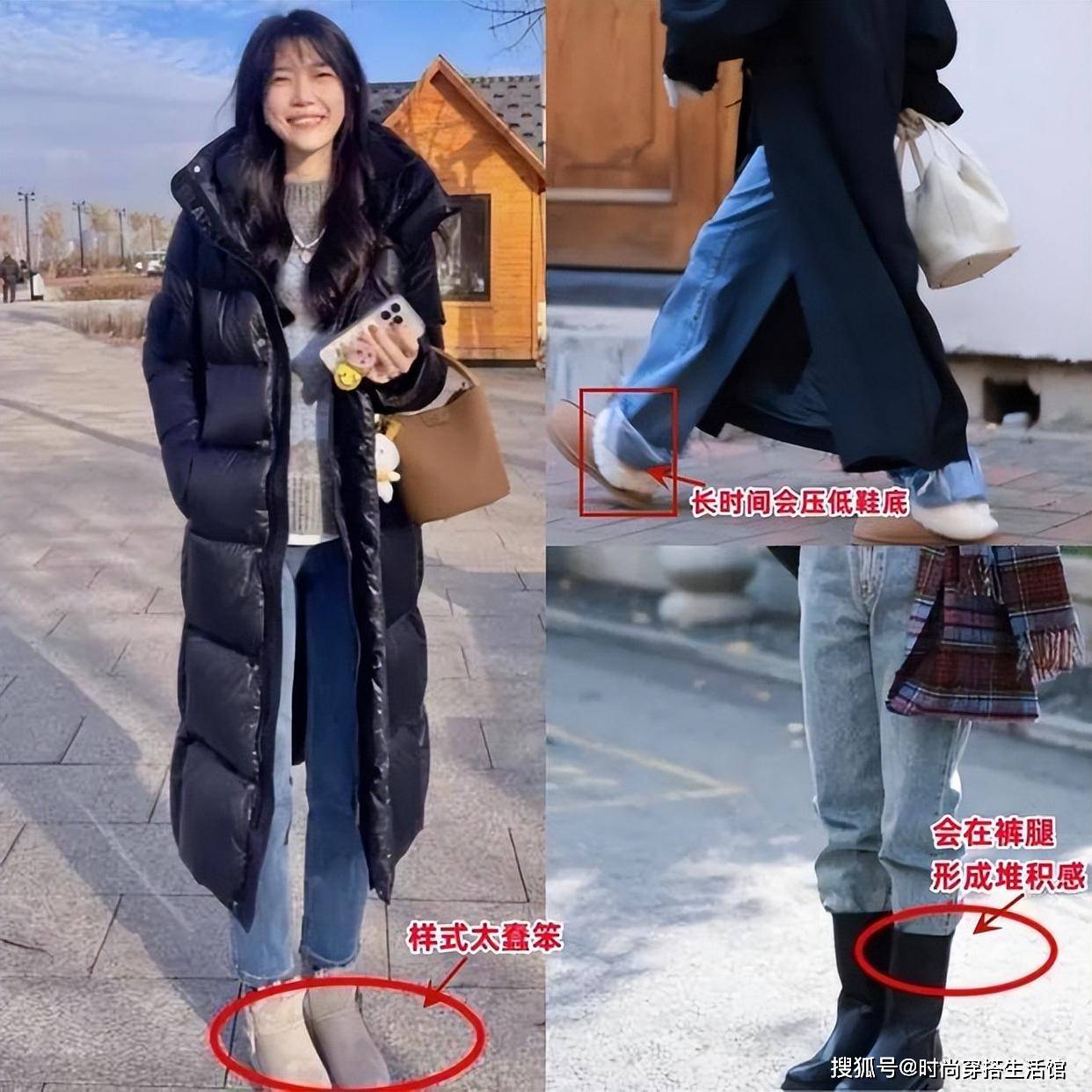 冬天穿羽绒服搭配雪地靴确实非常的舒适保暖,但是我们可以看到圆鼓鼓的鞋型设计,穿在脚上非常的臃肿和显胖,看起来像个“小企鹅”,尤其是选择搭配宽松的羽绒,整个穿搭会更加的臃肿和显胖,看起来完全没有曲线美,此外雪地靴的靴筒非常宽松,搭配上圆润的宽鞋面和鞋头,会让我们的双腿显粗一圈。