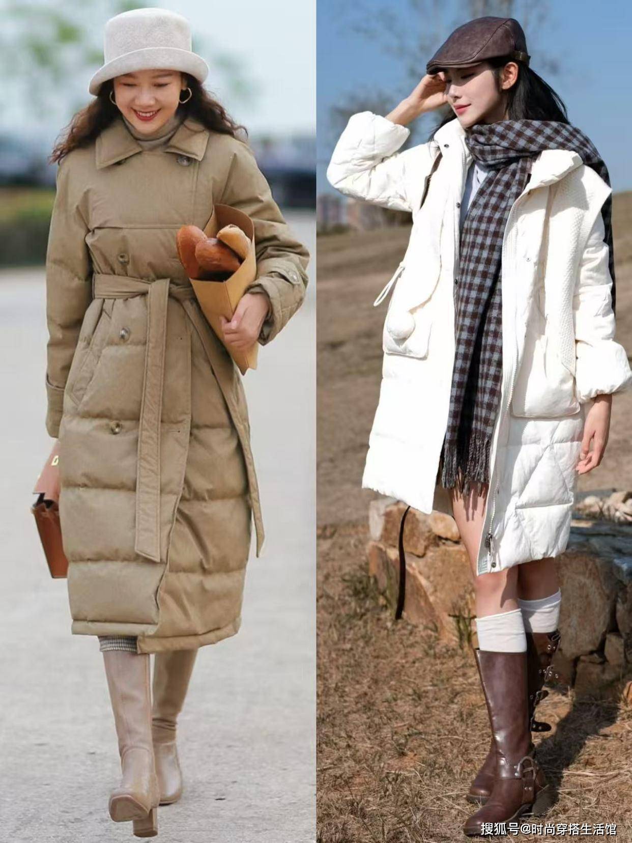 其次冬天穿羽绒服自然不能少了长羽绒服,穿在身上不仅保暖性强同时还能遮肉显瘦,但是我们要避免选择A字形和茧型的羽绒服,这两种羽绒服穿在身上很容易横向拉宽身材臃肿和显胖,最好的方式就是选择直筒的版型,搭配上过膝不过踝的长度,脚上搭配一双长筒靴,此外我们还可以搭配短裙,利用羽绒服和下摆之间露出一小截的肌肤,整个穿搭瞬间就变得轻盈和高级。