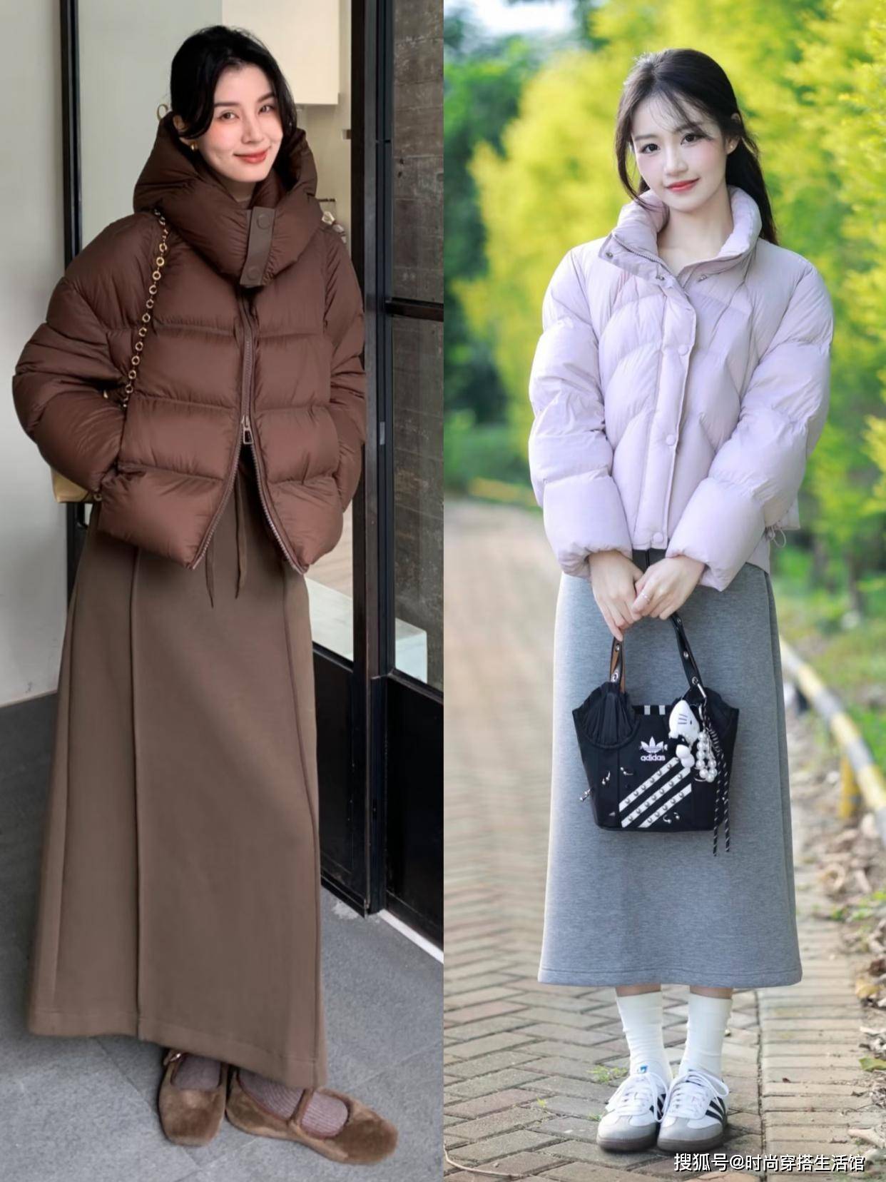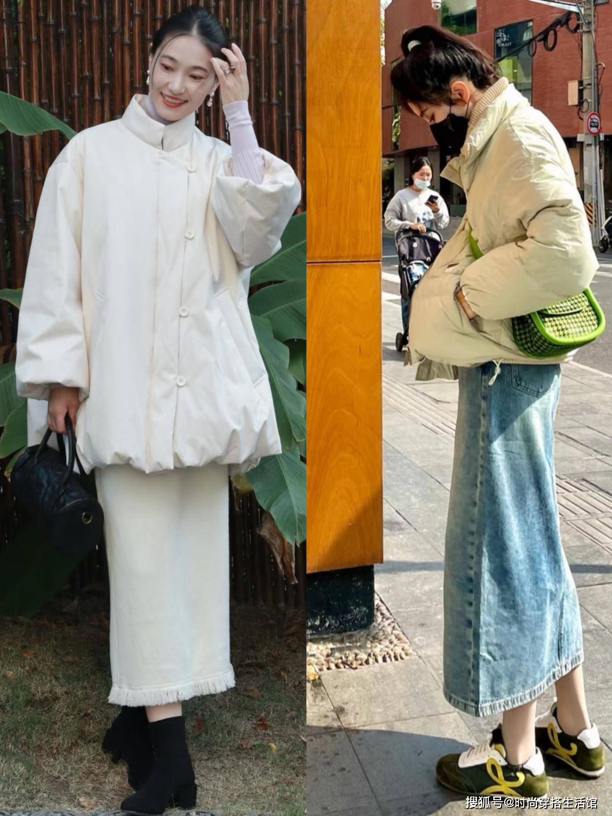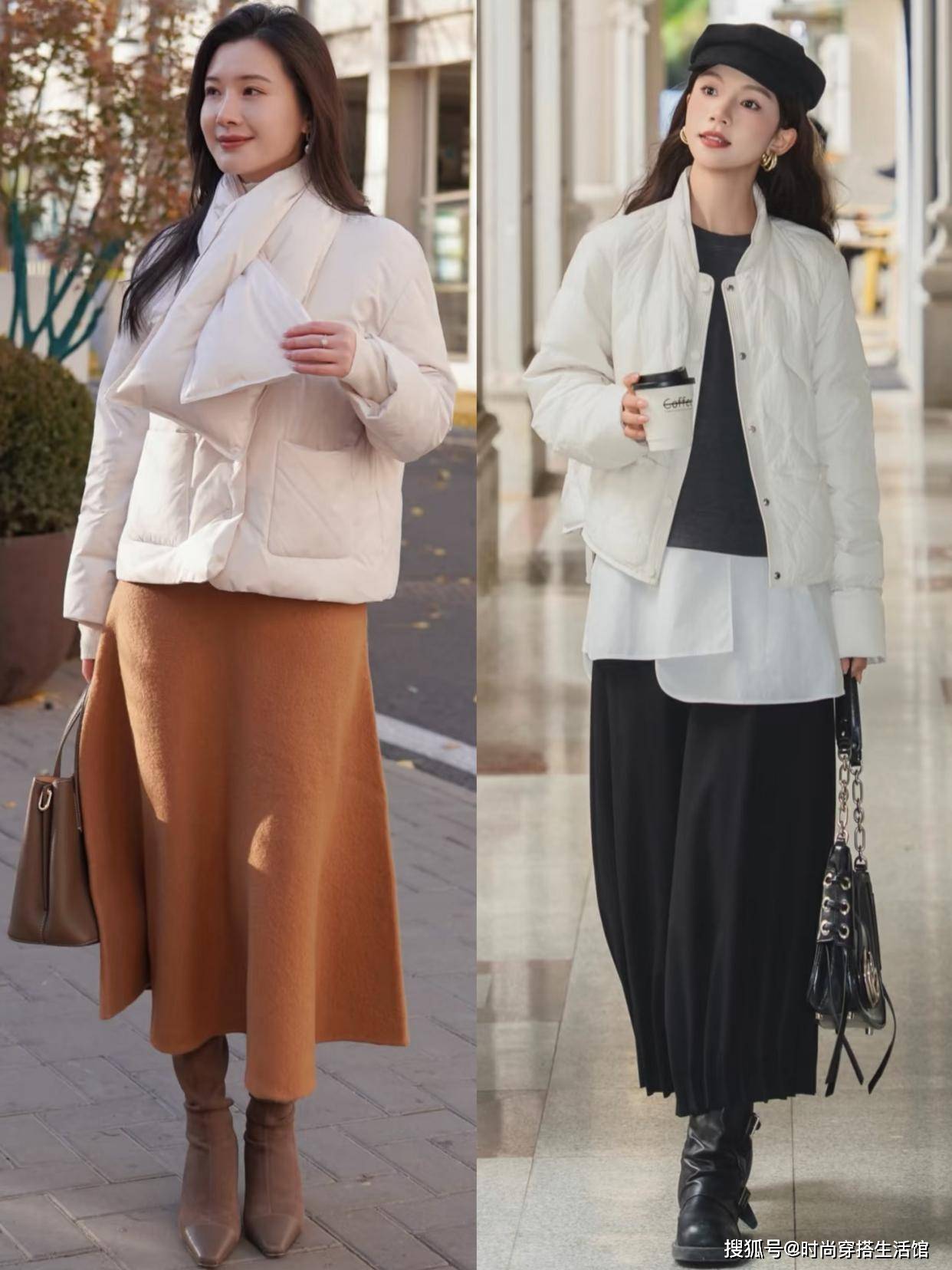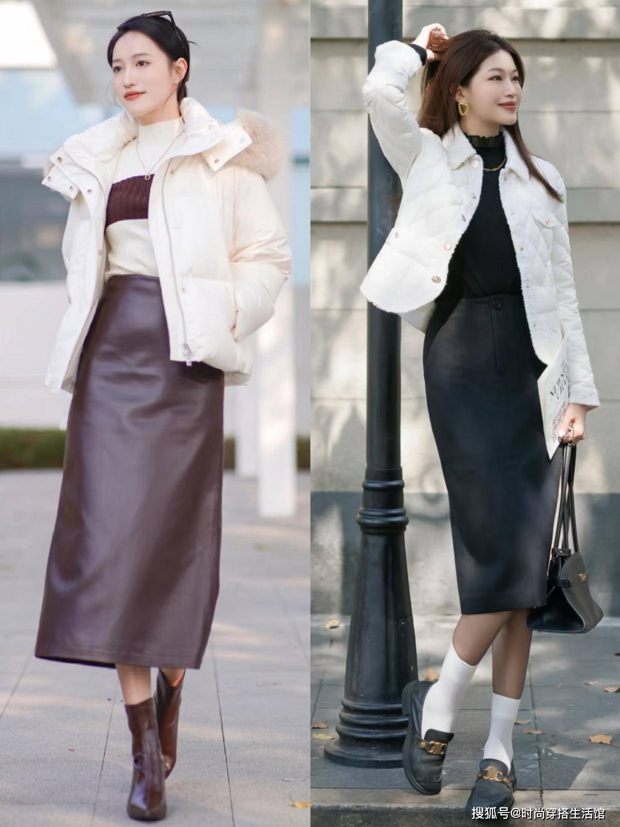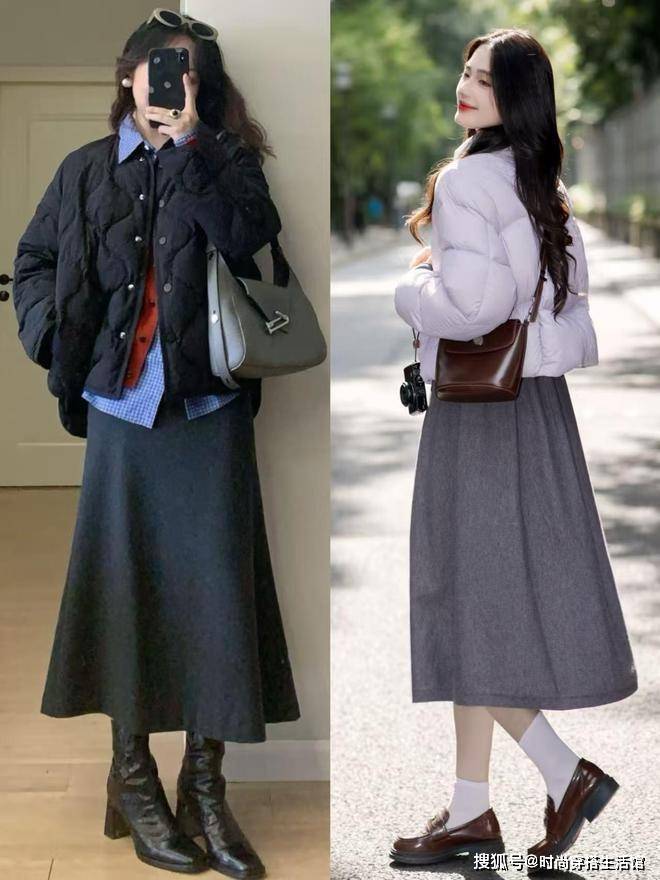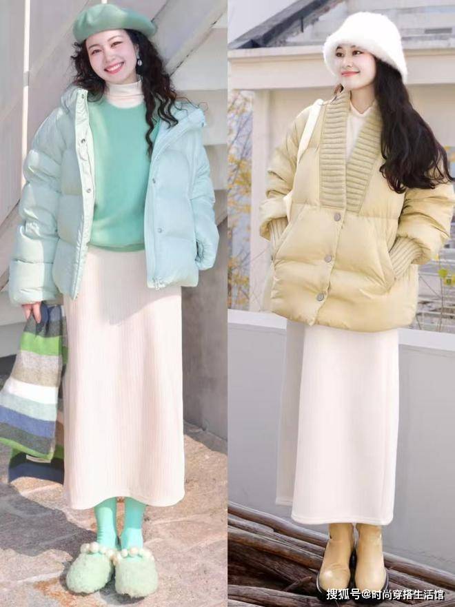⑵短羽绒+半身裙,能提高腰线,且更好驾驭