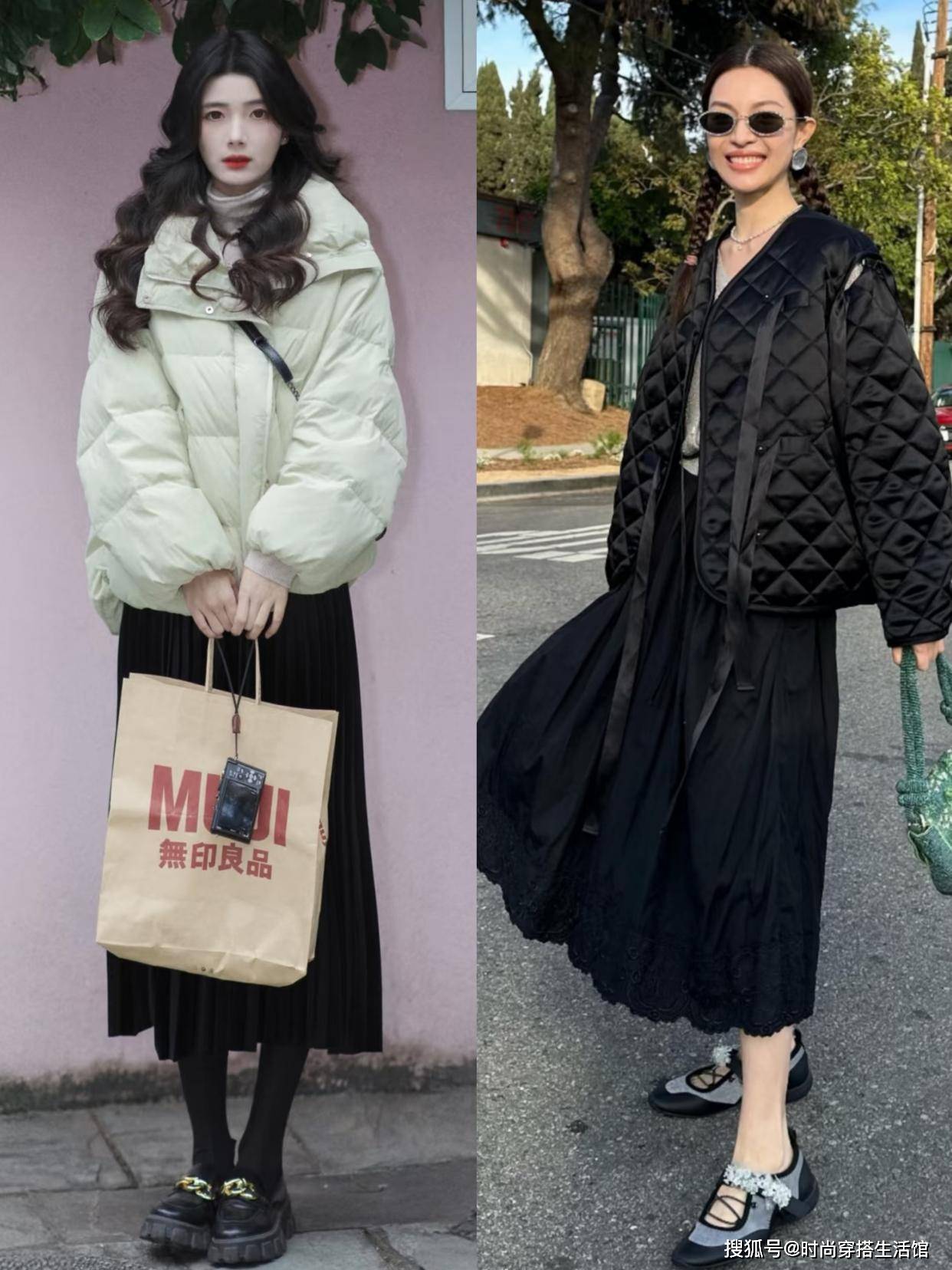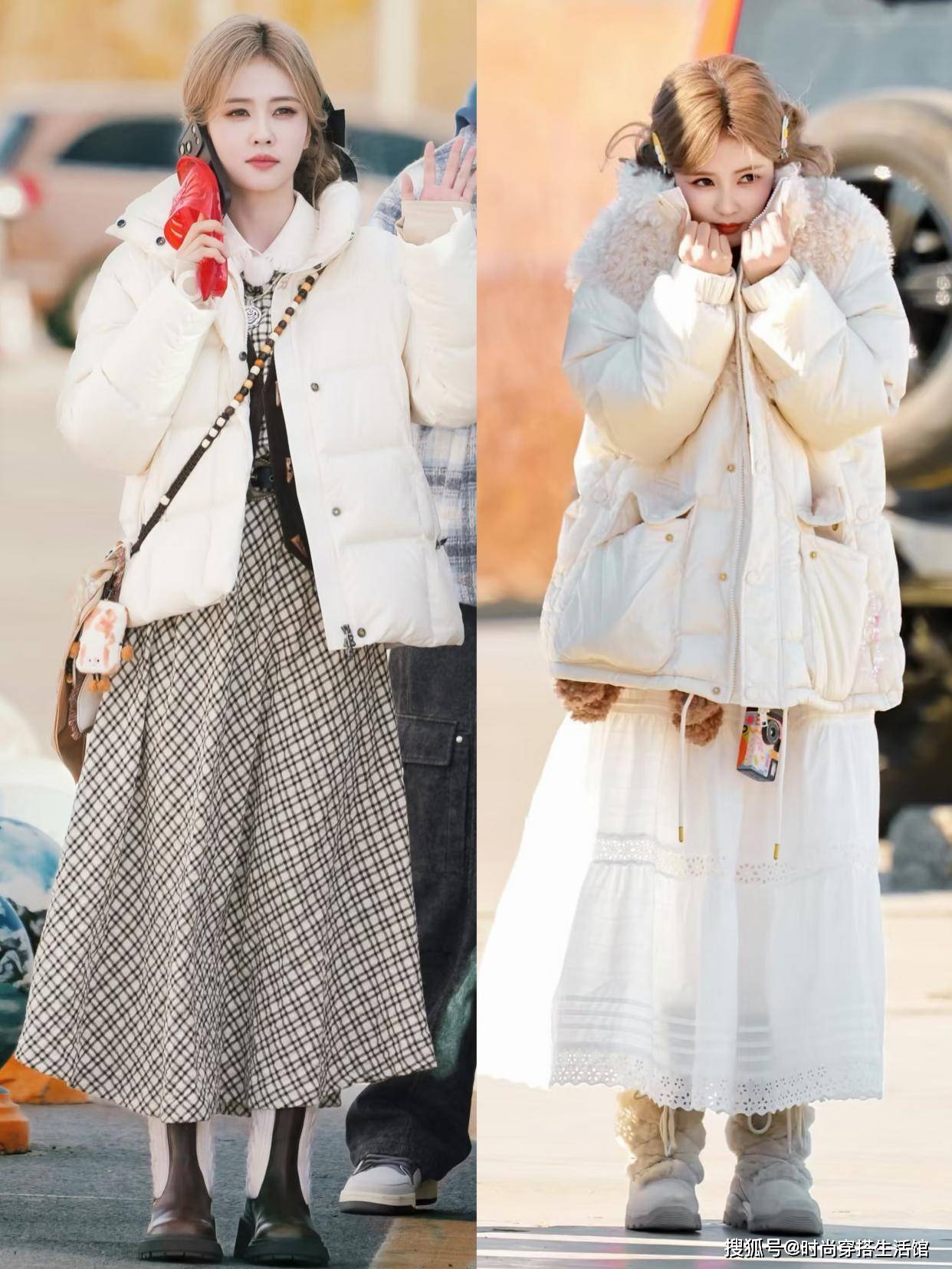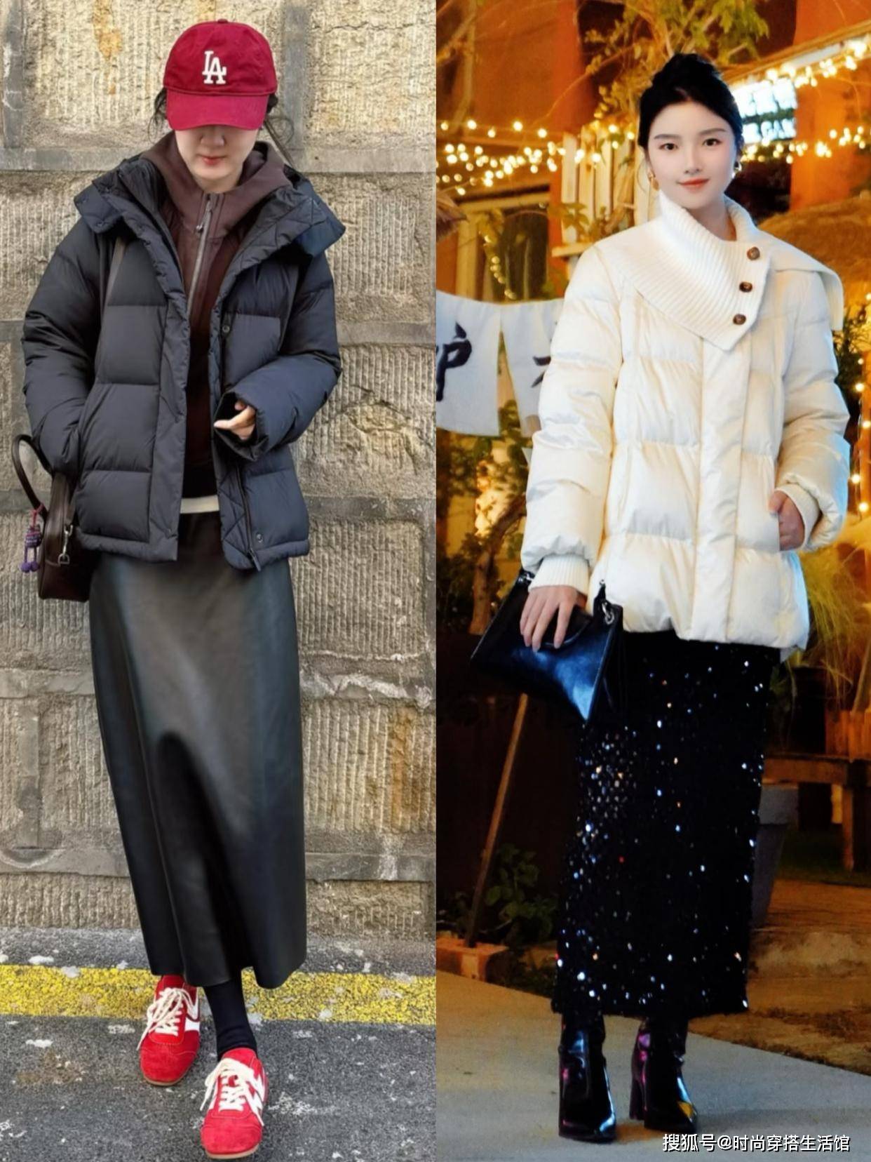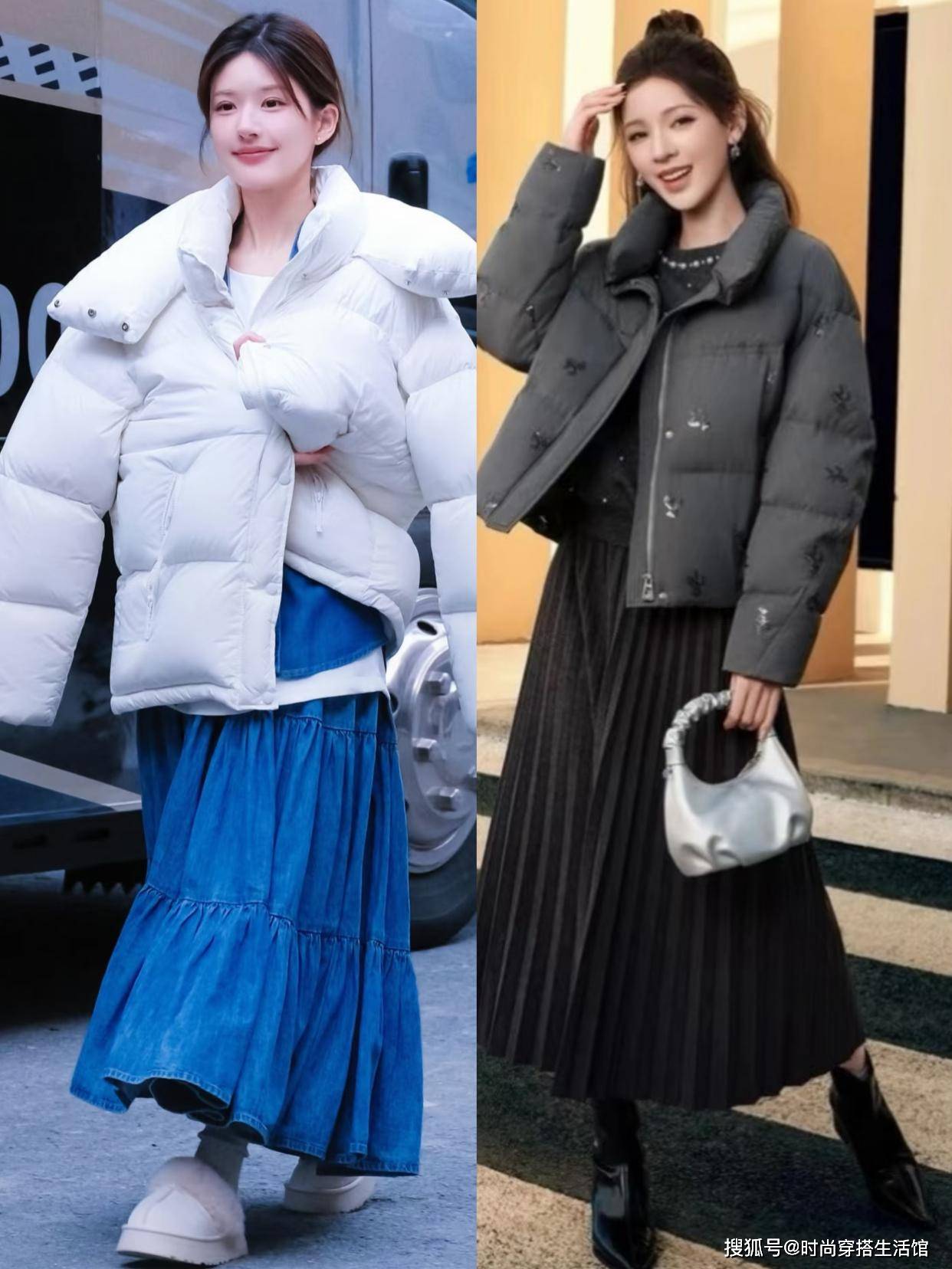 ⑵短羽绒+半身裙,能提高腰线,且更好驾驭