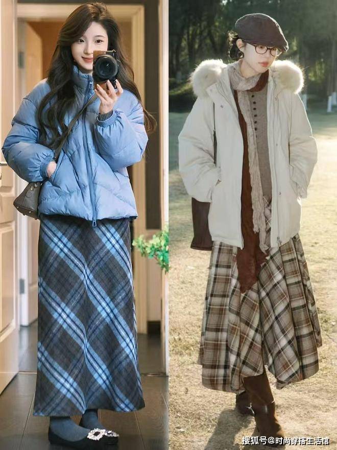 最后对于中年女性来说冬天穿短羽绒还不能少了格纹裙,毕竟冬天穿格纹裙不仅能够凸显出青春活泼感同时还能凸显出造型的灵感和气质,整个穿搭给人的效果就是复古时髦又高级,对于冬天来说我们选择过膝不过脚踝的长度,脚上就算搭配运动鞋也非常的复古显学院风。