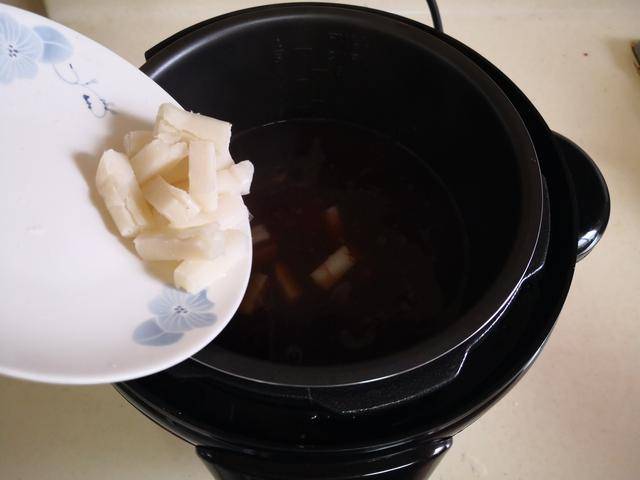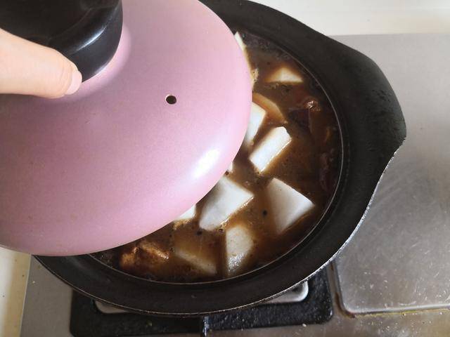 3. 加入适量的水,再加入准备好的萝卜块,加盖转为小火炖煮20分钟;