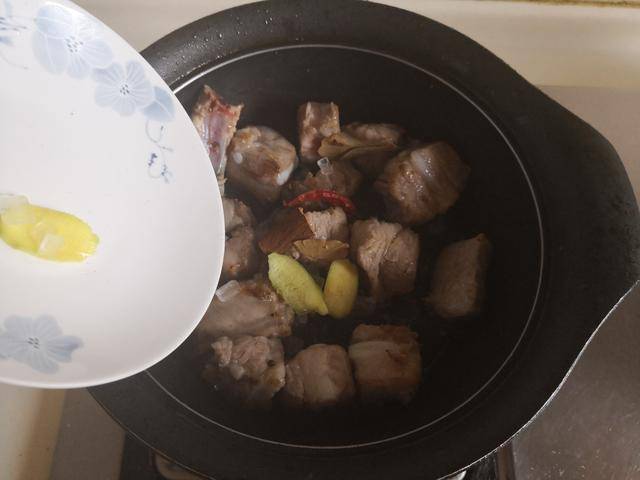 制作过程:1. 烧热锅放入适量的油, 将排骨块放进锅中煸炒干水分,加入少许冰糖、姜片和大料放进锅中翻炒几下;