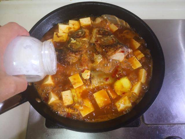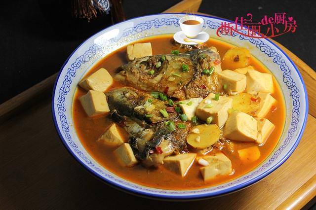 推荐菜谱【豆腐炖鱼头】 原料: 豆腐 1块 鱼头 1个 姜 少许 郫县豆瓣酱1勺 料酒 1勺 生抽 1勺 葱花 少许 油盐 少许