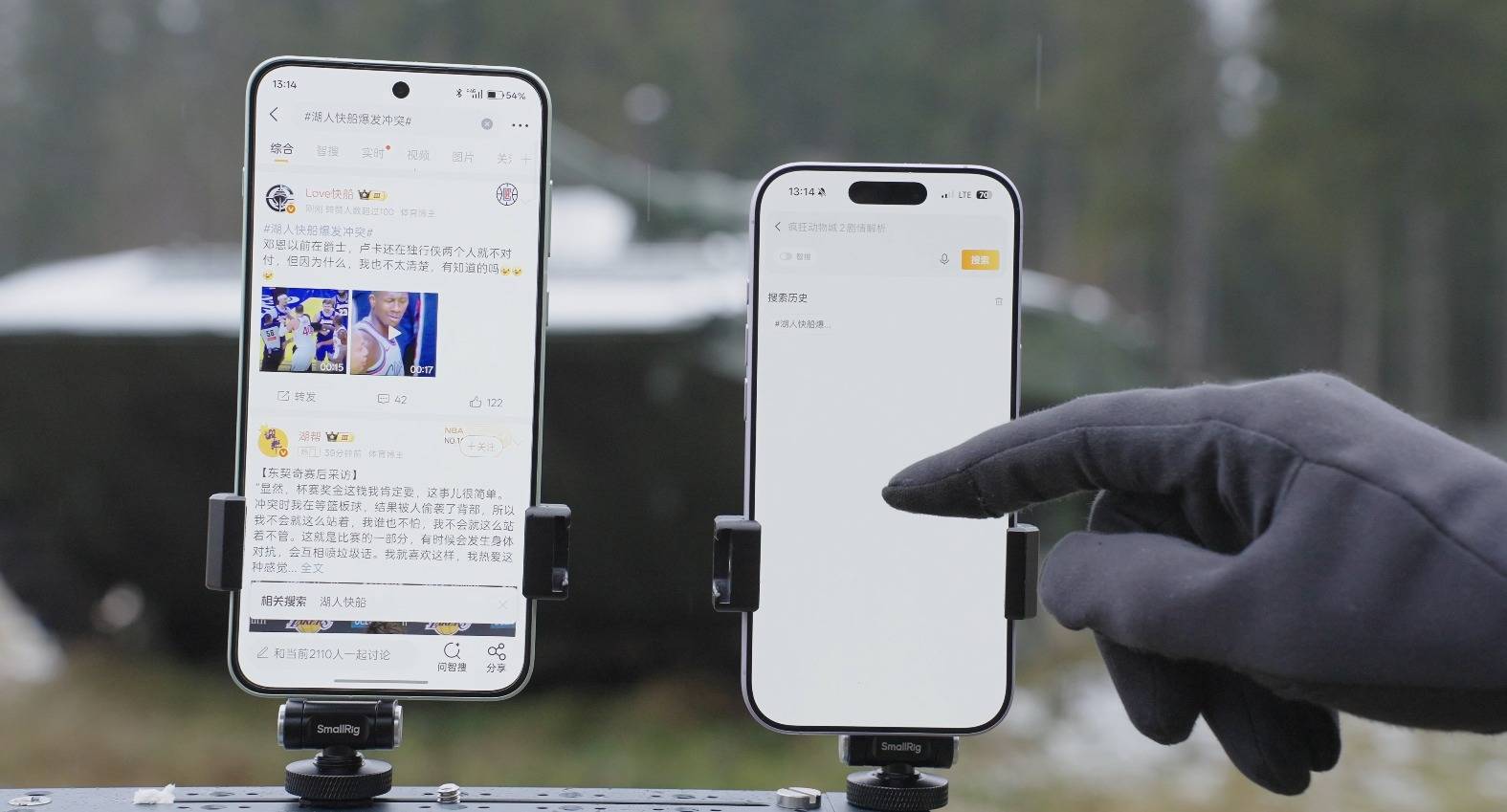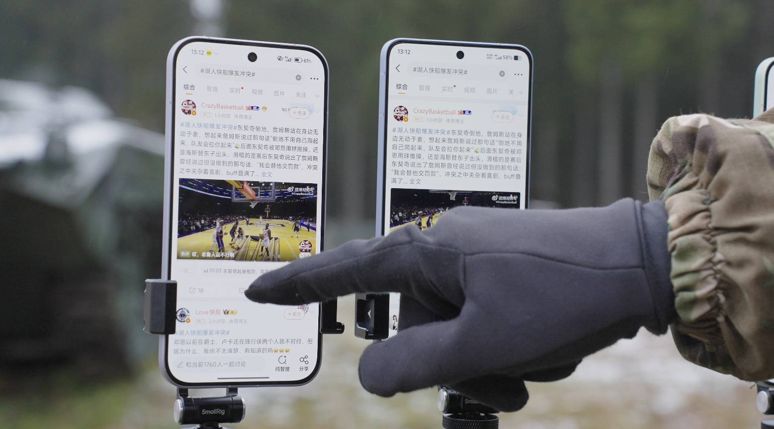 信号测试结束后,我们转场至莫斯科郊外的军事体验基地,在风雪交加的环境中开启触控专项测试。第一项是手套触控测试,模拟用户冬季户外戴厚手套操作手机的场景——测试人员佩戴厚实的军用手套,进行微博浏览滑动的基础操作,考验手机手机在极寒环境中的响应能力。
