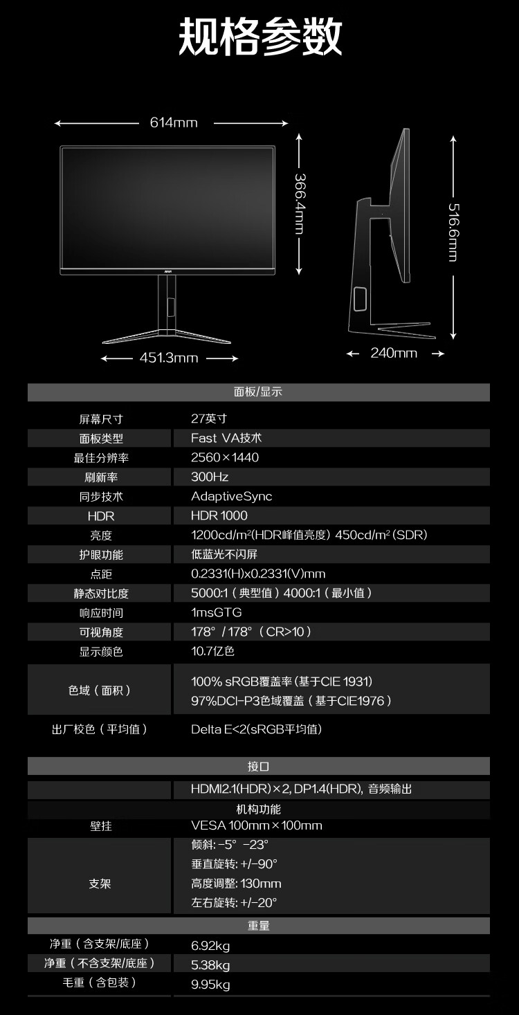 据悉,该显示器采用 2560×1440 分辨率 300Hz 全阵列直下式玻璃基 QD-Mini LED 背光 Fast VA LCD 面板,拥有 1152 个独立背光控制分区和 4608 颗 LED 灯珠。支持 4 档控光模式,SDR/HDR 亮度分别为 450nits/700nits,HDR 峰值亮度达 1200nits。