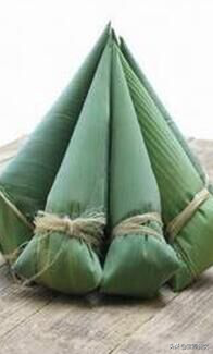 就这样,划龙舟和包粽子在端午节相遇了。粽子最早出现在战国时期,当时主要有两种样子:一种是用茭白裹的黍米,包成牛角状,叫角黍;另一种是用竹筒装米密封烤熟,古人称“筒粽”。