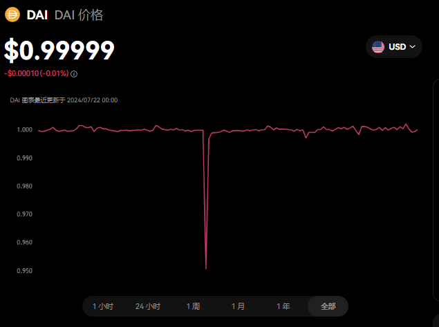 目前,DAI的价格为$0.99999,过去24小时内价格下跌了-0.01%。DAI的流通供应量和最大供应量均为5,276,558,797 DAI。我们会实时更新DAI/USD的价格。以下是DAI近期的价格表现:今日-$0.00010,-0.01%;7天$0.00019,+0.01%;30天-$0.00051,-0.06%;3个月-$0.00071,-0.08%。这些数据可以帮助你更好地了解DAI的市场动态。
