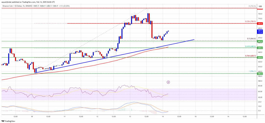 BNB 在 600 美元上方站稳脚跟后,开启了一轮新的上涨。它相继突破了 620 美元和 650 美元的阻力位,甚至一度超过 700 美元,表现优于以太坊和比特币。