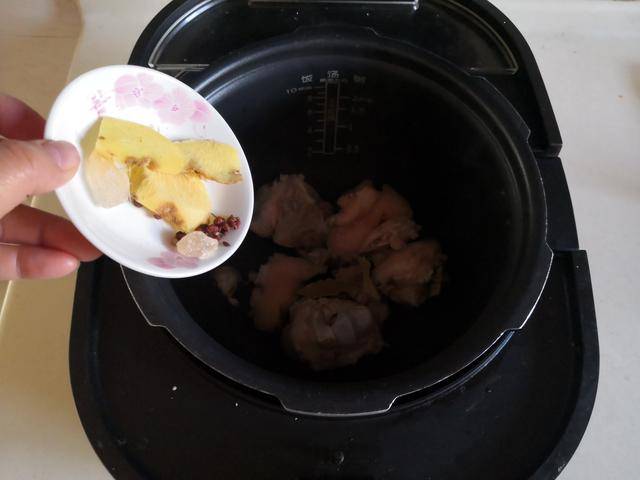 2. 加入少许姜片、冰糖和八角、桂皮大料等调味料,加入少许红烧酱油,再倒入1小罐啤酒,用啤酒炖煮既能帮助去腥,又能让猪手的口感更鲜嫩;