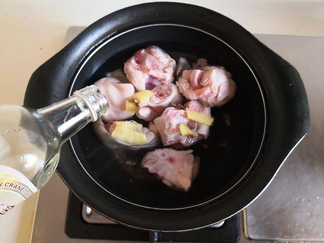 制作过程:1. 烧锅水,将准备好的猪蹄块冷水下锅焯水, 加入少许姜片和高度白酒去腥,焯出浮沫后捞出放入电压力锅中;