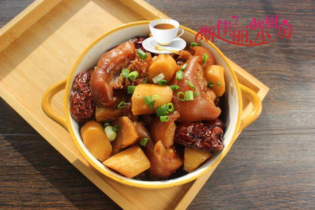 推荐菜谱【红枣山药炖蹄花】 原料: 猪蹄 2个 铁棍山药1根 红枣 1把 姜 1小块 冰糖 少许 啤酒 1小罐 桂皮1块 香叶1片 八角 1个 干辣椒 2个 花椒粒 少许 红烧酱油 1勺 高度白酒 1勺 葱花 少许 盐 少许