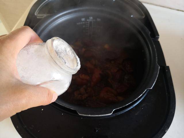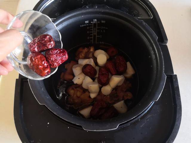 4. 待到蹄花炖煮好后,加入了准备好的铁棍山药段和洗净的红枣进锅后按下大火收汁的功能;