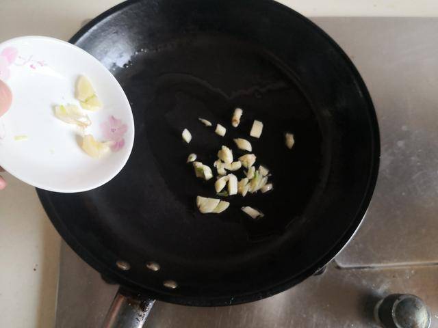 2. 烧热锅放入适量的油,加入少许蒜末放进锅中煸炒香;